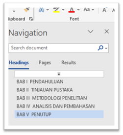 Lakukan pemasangan style Heading 1 ini kepada semua judul bab, sehingga panel Navigasi nantinya berbentuk seperti ini :