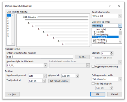 Langkah terakhir adalah memasangkan style Heading 1 yang baru ini kepada Multilevel List, supaya nanti ketika kita membuat sub-bab, otomatis nomor bab nya menjadi awalan dari nomor sub-bab.