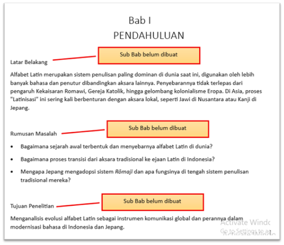 Perhatikan juga, bahwa judul sub-bab kita tidak memakai nomor apa-apa. Hanya teks judulnya saja, seperti pada gambar contoh di bawah :