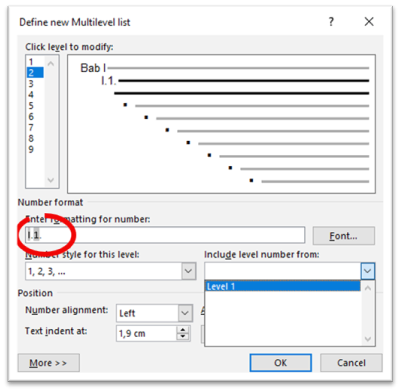 Cara membuat style untuk sub-bab-nya, dari menu [Home] buka menu [Define New Multilevel List]. Pada kotak dialog yang muncul, pastikan kita memilih Level 2, lalu pada kotak select Include Level Number From, pilih Level 1. Level 1 akan muncul pada kotak Number Format, lalu tambahkan titik setelahnya, seperti gambar berikut :