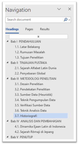 Jika semua judul sub-bab sudah dipasangkan style Heading 2, maka hasilnya pada panel Navigasi adalah seperti gambar di bawah ini. Perhatikan bahwa semua judul bab dan judul sub-bab masing-masing sudah mendapatkan nomor otomatis.