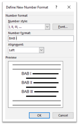 Pada kotak dialog yang muncul, pilih “I, II, III” pada Number Style, lalu tambahkan teks “Bab “ di kotak Number Format-nya