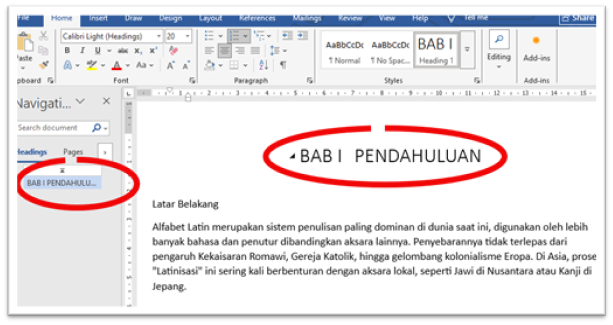 Kini judul “Pendahuluan” sudah berubah menjadi “Bab I Pendahuluan”, dan otomatis judulnya muncul pada panel Navigasi di sebelah kiri.