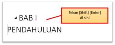 Untuk membuat judul bab-nya terpisah menjadi dua baris, tempatkan kursor keyboard tepat sebelum huruf P dari Pendahuluan, lalu tekan kombinasi keyboard [Shift] [Enter]. Ini akan memunculkan baris baru, tetapi baris baru tersebut masih dihitung sebagai paragraf yang sama, bukan paragraf baru.