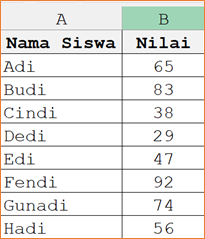 Dengan tabel di atas, tanpa menambah kolom baru, kita akan membahas cara menampilkan status lulus dari nilai-nilai tersebut. Kriterianya adalah :