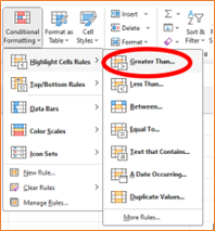 Dalam keadaan masih tersorot, buka lagi menu Highlight Cell Rules – Greater Than.