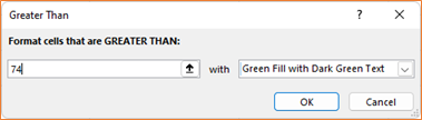 Pada kotak dialog yang muncul, ketik 74 pada kotak inputnya, dan pilih hijau pada formattingnya