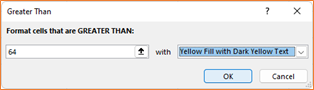 Lalu pada kotak dialog yang muncul, masukkan angka 64 untuk kriteria kedua dan pilih warna kuning.