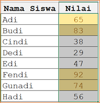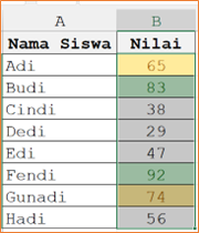 Gambar  20. Tabel nilai siswa dengan conditional formatting – highlight cell Rule