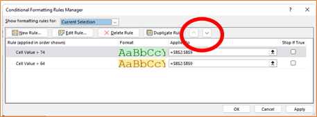 Ini terjadi karena urutan Rule Conditional Formatting yang perlu diperbaiki. Untuk itu buka menu Manage Rules, lalu gunakan tombol UP dan tombol DOWN untuk mengubah urutan Rule-nya. Boleh yang kuning diturunkan ke bawah, atau bisa juga yang hijau dinaikkan ke atas.