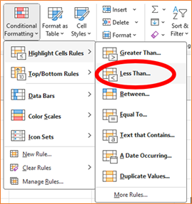Buka kembali menu Highlight Cell Rules, tetapi kali ini pilih Less Than