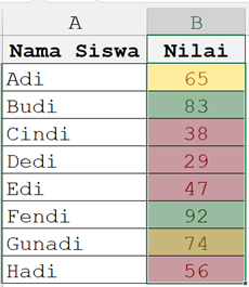 Klik tombol OK, maka sekarang tampilan kolom nilainya sudah menampilkan warna merah kuning hijau dengan benar untuk nilai siswa yang GAGAL, REMEDIAL, dan LULUS.