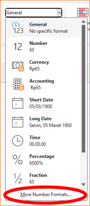 Lalu buka pengaturan number format dari menu Home – More Number Formats, atau bisa juga dari kombinasi tombol shortcut [CTRL] dan [1].