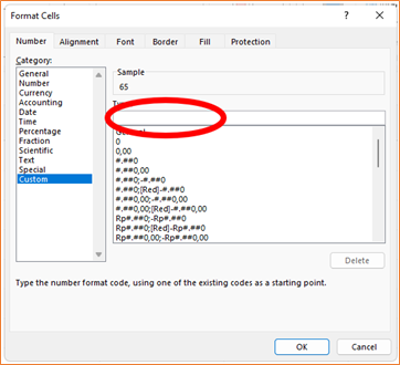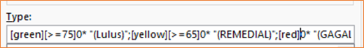 Kode Format : [>=65]0* “(Remedial)” Hasil yang diinginkan : 74                 (Remedial)