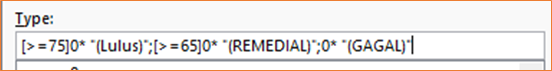 Kode Format : [>=75]0* “(Lulus)” Hasil yang diinginkan : 92                         (Lulus)