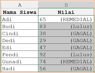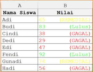 Ini kurang lebih sama seperti formatting yang pertama, hanya saja batas nilainya adalah >= 65, dan teksnya adalah REMEDIAL.
