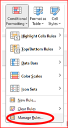 Tetapi warna untuk Gunadi dan Hadi masih salah. Maka selanjutnya kita perlu mengubah kriterianya atau Rule-nya. Dalam keadaan kolom nilai tersebut masih tersorot, buka menu Manage Rules… seperti gambar berikut :