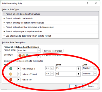 Klik tombol OK untuk menyimpan perubahan ini. Maka hasilnya adalah, sekarang warna lingkaran merah kuning hijaunya sudah benar sesuai dengan kriteria lulus yang kita inginkan.