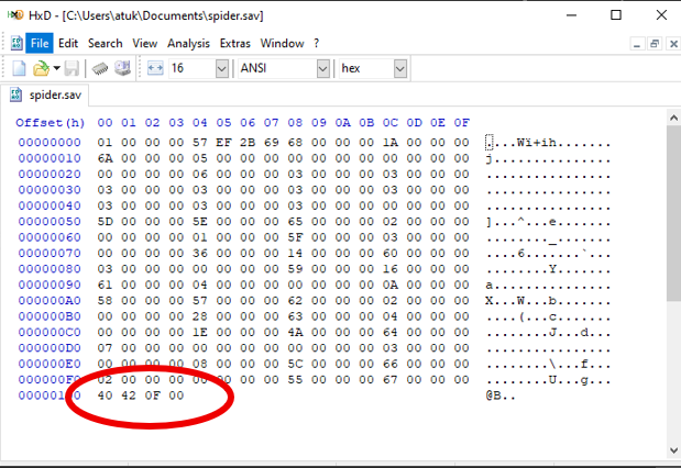 Jadi skor kita yang 1.000.000 di dalam game tersebut, akan tersimpan sebagai 40 42 0F 00 di dalam file save gamenya. Lihat gambar di bawah :